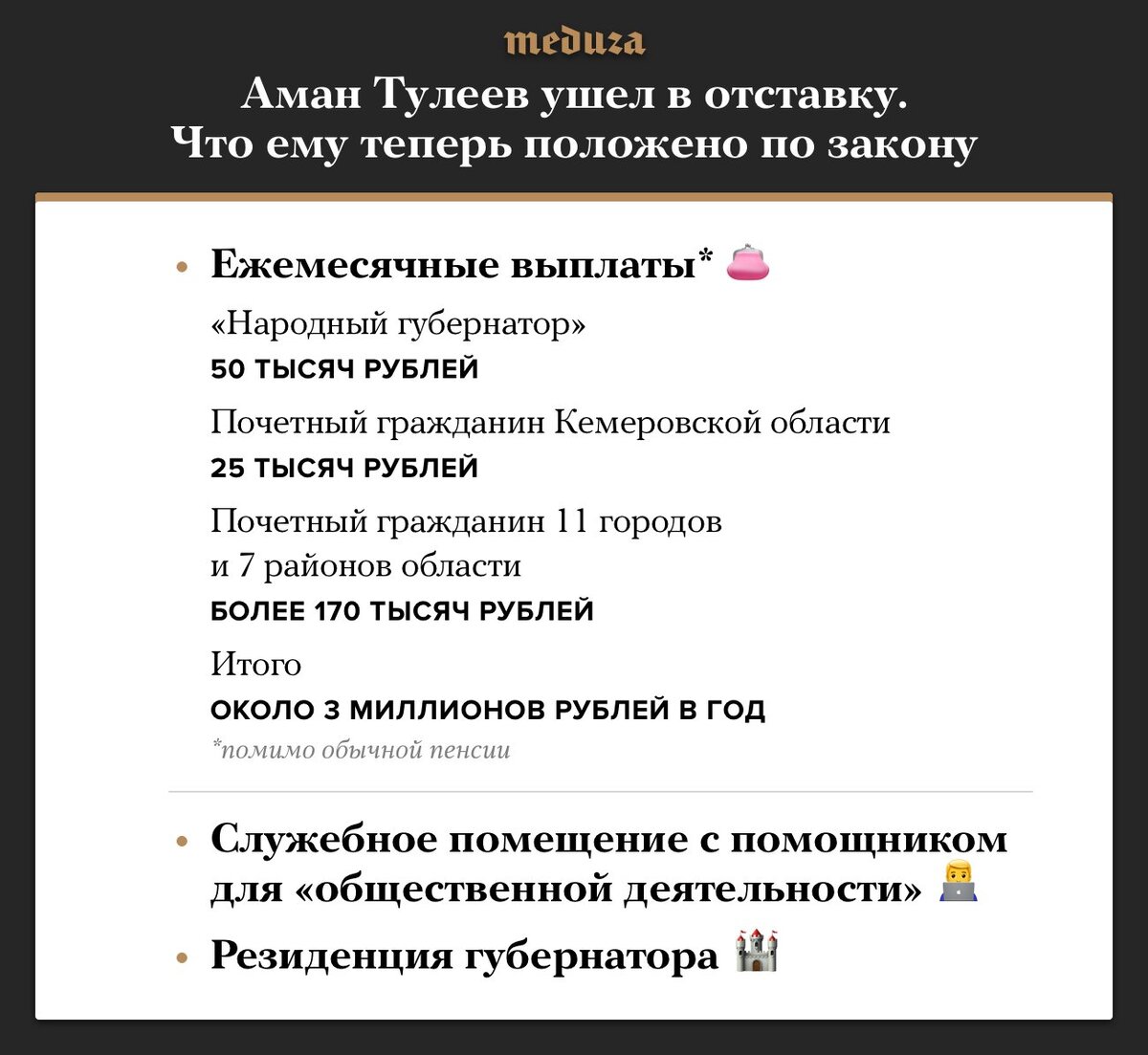 1 апреля губернатор Кемеровской области Аман Тулеев подал в отставку. На следующий день полномочный представитель президента в Сибирском федеральном округе Сергей Меняйло напомнил, что по областному закону 2011 года за Тулеевым останется звание «Народный губернатор» и другие предусмотренные этим документом гарантии. Ссылка на статью: https://meduza.io/short/2018/04/02/aman-tuleev-ushel-v-otstavku-chto-emu-teper-polozheno-po-zakonu Хочется добавить, что Аман Тулеев руководил Кузбассом более 20 лет, и что его место на посту губернатора занял Сергей Цивилев.