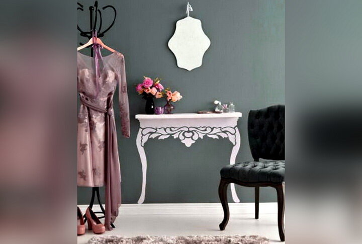 В этом уроке вы найдете красивый шаблон и пошаговую инструкцию по созданию полки-столика своими руками. Мы не будем делать настоящий стол – мы просто аккуратно его нарисуем. Эта красивая имитация элемента мебели во французском стиле идеально впишется в интерьер и разнообразит его. Такая самодельная полка особенно придется по вкусу девушкам и маленьким девочкам. В данном уроке полка будет белой, однако если вы делаете декоративный столик для маленькой принцессы, разумно использовать розовый, голубой, желтый или другой яркий цвет. Если же вам важно сохранить классику французского стиля, оставьте имитацию белой или сделайте ее бледно-голубой. Сразу стоит сказать, что для того, чтобы сделать полку своими руками, вам не понадобятся высокие художественные навыки. Вся красота рисуется по простому трафарету, который вы найдете ниже. Нам понадобится: Шаблон для создания полки-столика выглядит следующим образом. Срисуйте его или распечатайте, а затем отрежьте лишние детали, чтобы перенести шабло