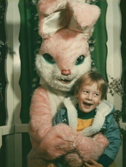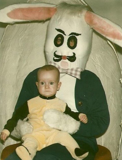 1. Судя по его лицу, этот кролик готов съесть бедного маленького мальчика. 2. Лицо этого ребёнка говорит всё! 3. Поза этой маленькой девочки говорит всё, что она хочет произнести вслух. Кто разработал это зловещее зайцеобразное существо?! 4. Эта фотография была сделана за несколько мгновений до того, как ребёнок спасался бегством, чтобы не стать обедом кролика. 5. Эти глаза!! 6. Этот костюм пасхального кролика больше напоминает ка