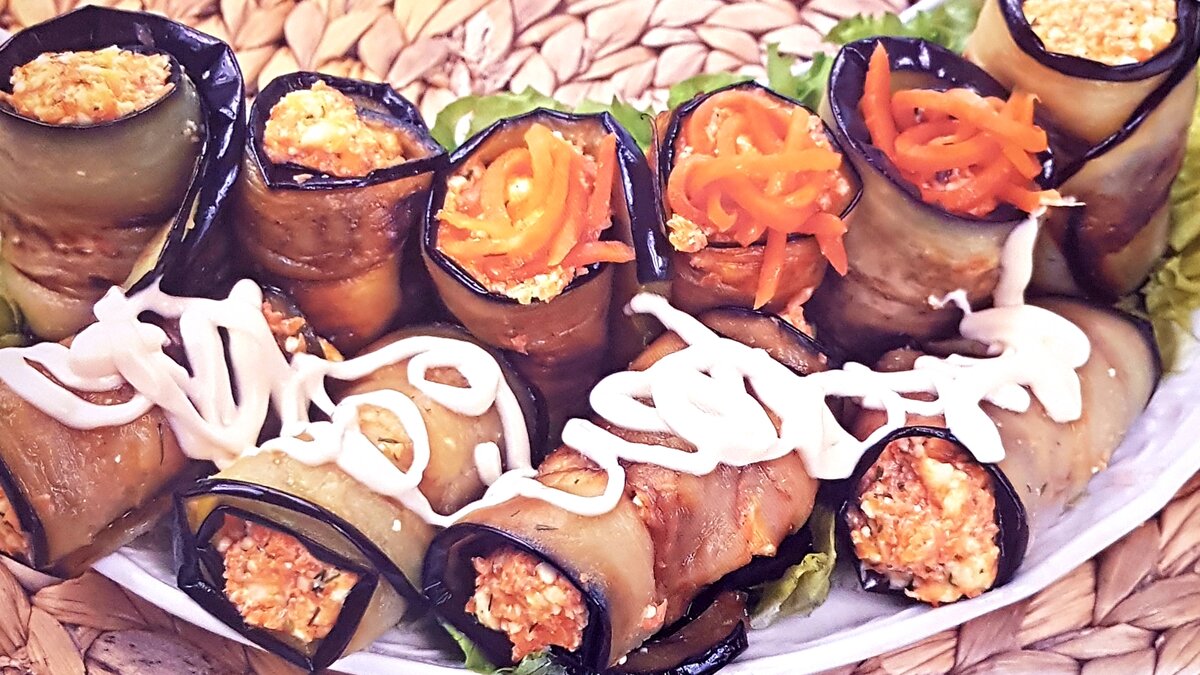 Быстро и просто, а главное вкусно)) Баклажан - 2 шт. Морковь по корейски - 250 г Сыр "брынза" - 200 г Майонез - 2 ст. Ложки Специи и зелень - по вкусу. Аккуратно нарезать в доль баклажаны. Влить на сковороду растительное масло и обжарить до золотистого цвета. Мелко нарезать корейскую морковь. Добавить специи, сыр и посыпать зеленью. Хорошо перемешать. Начинка готова! Осталось завернуть начинку в баклажаны. Блюдо готово! Приятного аппетита! Перед подачей на стол украсить по желанию зеленью.