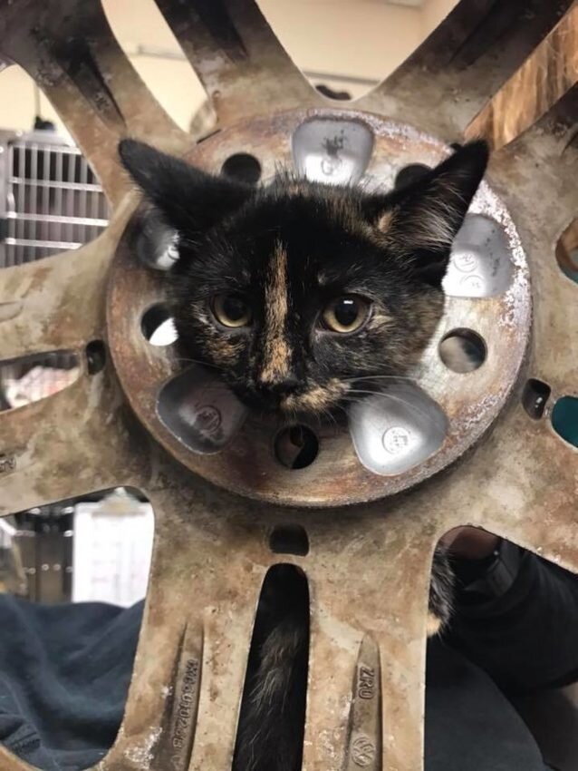 Мир для маленького котёнка – что-то огромное, неизведанное и полное мест для игр и развлечений. Такое отношение к окружающей среде подвело малыша Куки, который вместо игры угодил в пренеприятную ситуацию. Куки застрял. Четырехмесячный малыш изучал гараж своей семьи. Там было с чем поиграть, и все шло прекрасно, пока на его глаза не попалось запасное колесо от автомобиля. Попытавшись поиграть с ним лапой и поняв, что оно слишком тяжелое, котенок не придумал ничего лучше, как засунуть в отверстие в центре колеса свою голову. Вытащить её он уже не смог. Когда хозяева нашли бедолагу, они решили отвезти его и колесо в ближайшую ветеринарную клинику, специалисты которой ещё не знали, что им придется примерить на себя роль шиномонтажников. «Они позвонили и сказали, что котёнок застрял в колесе, но мы понятия не имели, в какой именно части колеса он застрял, и как это могло выглядеть», - рассказывают врачи. «Когда семья зашла к нам с колесом, в центре которого виднелась голова глупышки, мы выд