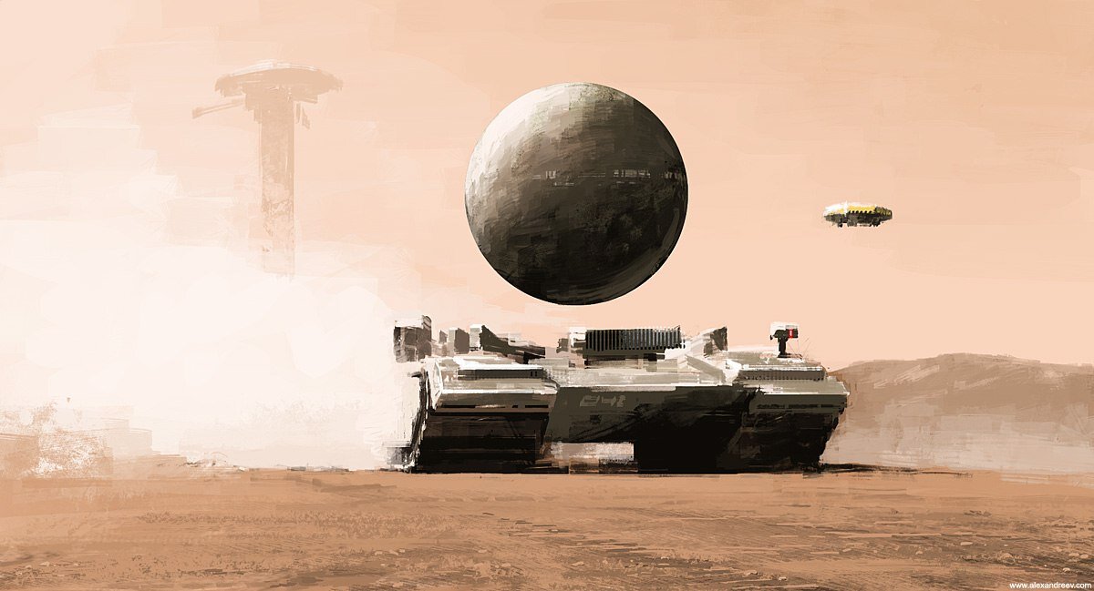 Имя польского писателя-фантаста Станислава Лема знакомо многим. Его романы "Солярис", "Дневники Ийона Тихого", "Кибериада" стали культовыми для целых поколений. Роман "Непобедимый", написанный в 1955 году, тоже относится к их числу. Замечательный художник Алексей Андреев сделал серию иллюстраций к "Непобедимому", которые мы и публикуем. Под каждой иллюстрацией приведён соответствующий отрывок из романа. На этот раз потрескивание остывающих дюз еще не прекратилось, когда корабль выдвинул аппарель, ферму подъемника и окружил себя цепочкой энергоботов. Затем под защитой силового поля была сконцентрирована группа из пяти вездеходов, к которой присоединился вдвое больший, чем они, похожий на апокалиптического жука с синеватым панцирем, самоходный излучатель антиматерии. (Станислав Лем, "Непобедимый") Красноватая туча, подброшенная на сотни метров, опускалась. Из нее вырос тупой нос "Непобедимого", его корпус - опаленный трением в атмосфере и поэтому приобретший цвет старой скалы шершавый
