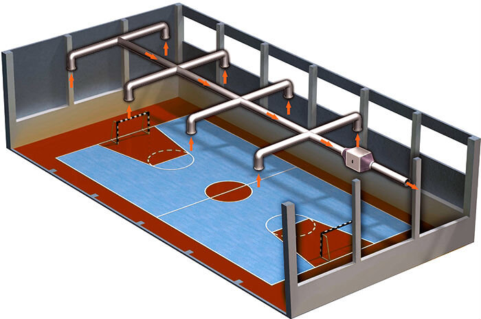 Спортивные сооружения являются строительными объектами, которые нуждаются в мощной и стабильно работающей вентиляции. К таковым относятся стадионы, катки, спортивные площадки и другие объекты, на территории которых проводятся масштабные спортивные мероприятия. Задачи вентиляции в спортивных сооружениях Особенностью подобных сооружений является повышение тепловыделение за счет физических нагрузок спортсменов, которые нуждаются в поступлении свежего воздуха. Актуальной эта проблема является особенно для командных видов спорта, где участие в соревнованиях принимает большое количество людей. Отдельного внимания заслуживают трибуны с болельщиками, на которых могут собираться тысячи человек. Для их комфорта и элементарной безопасности в обязательном порядке необходимо оптимальное состояние микроклимата. Должен соблюдаться температурный режим, определенная влажность воздуха и стабильный воздухообмен. Чтобы спортсмены и зрители находились в комфорте, следует правильно спроектировать и устан