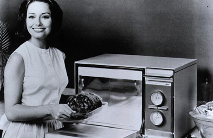В 1941 году американская компания Рэйтеон, занимающаяся производством комплектующих для радаров, выигрывает выгодный контракт на производство нового радарного устройства на основе магнетрона. Задача выполнения огромного заказа ложится на плечи ведущего инженера фирмы, Перси Спенсера. Осенью 1945 года, он работает в лаборатории и, проходя мимо магнетрона, замечает, что шоколадный батончик в кармане расплавился. Спенсеру приходит озарение: поместив прибор в закрытое пространство и сфокусировав энергию, он может создать эффективную печь быстрого приготовления, которая совершит революцию в домашней кухне. 8 октября 1945 года Рэйтеон обращается за патентом на передовой прибор для приготовления еды, так называемую «радарную электронную печь». Два года спустя, в 1947 году, на рынке появляется первая микроволновая печь «Radarange». Она была высотой более полутора метров и стоила более 5000 долларов, мощностью составляла 3 киловатта, а для ее работы использовалось водяное охлажде