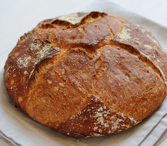 Обычный французский хлеб из безопарного "багетного" теста. Такой хлеб лучше всего получается, если приготовить его вручную, без применения комбайна или миксера и без вымешивания теста как такового. Процесс приготовления очень легкий и не трудоемкий. Его может осилить даже самый неопытный хлебопек. Ингредиенты на один большой каравай: - 500 гр муки( смешиваем в равных пропорциях высший сорт и 1 сорт муки) - 350-400 гр воды (комнатной температуры) - 10 гр соли - 15 гр свежих дрожжей Если вы хотите получить более пышный хлеб, то в муку можно подмешать немного аскорбинки. половину большой таблетки. Просто разотрите её и смешайте с мукой. Если вы желаете более румяный хлеб, можно добавить маленькую ложечку белого (диастатического солода) Муку просеять и смешать с солью, аскорбинкой, солодом. В объемную миску влить 350 гр воды, раскрошить в нее дрожжи и, помешивая, дать им разойтись. Затем всыпать сразу всю муку и перемешать лопаткой. Именно сейчас вы должны добавить или нет остато