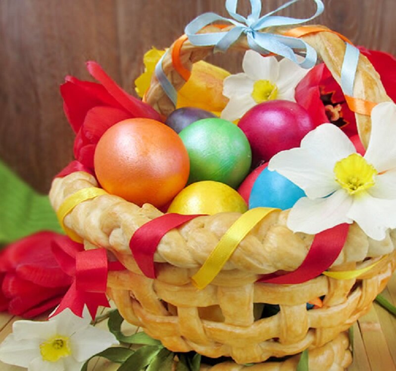 Пасхальная корзинка давно стала неотъемлемым атрибутом светлого праздника Пасхи. Ее украшают, собирают, покупают для нее красивые полотенца. В праздник ждут возвращения родных из церкви с освященной корзиной, полной праздничных угощений. Приготовление - Возьми половину оставшегося теста. Раскатай его в пласт такой же толщины и точно так же разрежь на полоски. Вплети горизонтально получившиеся полоски в те, что уже разложены на миске. Поочередно пропускай их над и под вертикальными полосками. В месте, где вертикальные полоски перекрещиваются, образуется толстый слой теста. Прижми его стаканом, чтобы сформировать дно корзинки. Излишки теста обрежь. Ингредиенты Приятного аппетита, и пусть светлый праздник Пасхи будет теплым и счастливым!