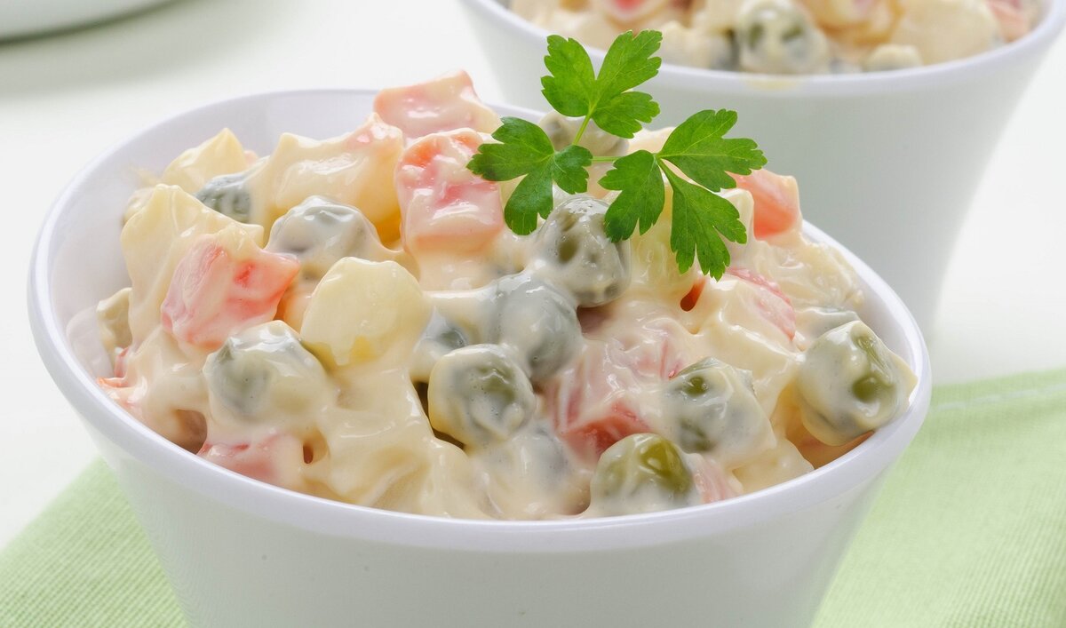 Салат Оливье – это праздничное блюдо, но при желании его можно готовить чаще. В таком случае придется убрать калорийные компоненты рецепта. Если вы не гурман и не стремитесь в точности воспроизвести классический рецепт, то даже не заметите подмены. Используйте маложирную сметану или греческий йогурт вместо майонеза. 100 граммов майонеза Провансаль – 624 ккал и 67 г жиров, когда сметана 15% содержит 158 ккал, а греческий йогурт – 66 ккал. К молочным продуктам следует добавить специи по вкусу – перец, горчицу, соль. Сократите количество картофеля. Вы больше не живете в эпоху дефицита – нет смысла добиваться объема углеводами. Используйте куриное филе вместо мяса и колбасы. Вовсе не обязательно варить грудку. Запеките её с любимыми специями или в любимом маринаде. 257 калорий против 110 – выбор в пользу птицы очевиден. Используйте меньше яиц. Если в рецепте указано 4 яйца, возьмите два целых и ещё два яичных белка. Это позволит сэкономить больше 100 калорий.