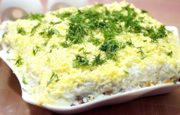 Как-то днем захотелось перекусить и ничего другого, кроме салата, в голову не пришло. Но мы то знаем толк в быстрых и вкусных рецептах! Очень нежный и вкусный, этим салатом можно не только перекусить и запросто удивить гостей, которые уже на пороге и звонят в дверь. Попробуйте и вам обязательно понравится! Ингредиенты: Рецепт: Для начала нам нужно сварить куриную грудку в подсоленной воде. Остужаем ее и нарезаем мелкими кубиками или брусочками. Укладываем мясо первым слоем в нашу салатницу. Смазываем смесью сметаны и майонеза. Теперь нам нужно очистить яблоко от кожуры и сердцевины. Натираем его на терке и так же укладываем следующим слоем, промазываем соусом. Теперь огурец. Его можно очистить от кожуры, или же просто натереть на терке. Делаем из него следующий слой, смазываем нашим соусом. Сыр так же натираем на терке, укладываем в салатник и смазываем. Теперь разделяем яйца на белки и желтки. белки укладываем в салатник смазываем соусом. Сверху посыпаем крошками желтка. Готово! В иде