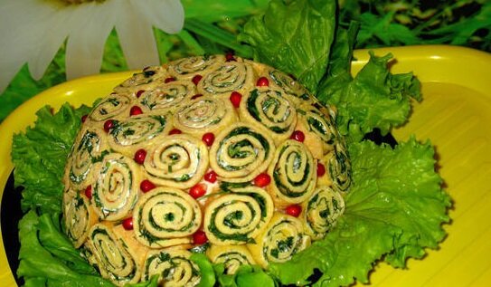 Нам понадобиться: 1.Картофель отварной – 400 гр. 2.Горошек зеленый консервированный – 250 гр. 3.Мясо копченое – 250 гр. 4.Майонез 5.Яйца – 5 шт. 6.Лук репчатый 7.Мука – 2 ст. л. 8.Масло растительное – 2 ст. л. 9.Петрушка 10.Сода – 1 щепотка Способ приготовления: Смешиваем в глубокой мисочке, яйца смешиваем с одной ложкой майонеза, добавляем щепотку соды, соли и муки, хорошо перемешиваем.На сковороде испечь 2-3 блинчика.А теперь приготовим и сам салат, отвариваем картофель и нарезаем его после кубиком.Лук нарезать кубиком и обдать кипятком после чего отжать.В миске смешиваем картофель с луком, добавляем копченное мясо, и горошек, все хорошо перемешиваем. Глубокий салатник застелить пленкой, в нее кладем блинчики которые предварительно нужно смазать майонезом и скрутить в трубочку и нарезать толщиной 3-4 см. эти рулетики вы кладете в миске первым слоем.По верх блинчиков выложить салат и хорошо утрамбовать, затянуть пленкой и поставить в холодильник на 2-3 часа.После этого салат пер
