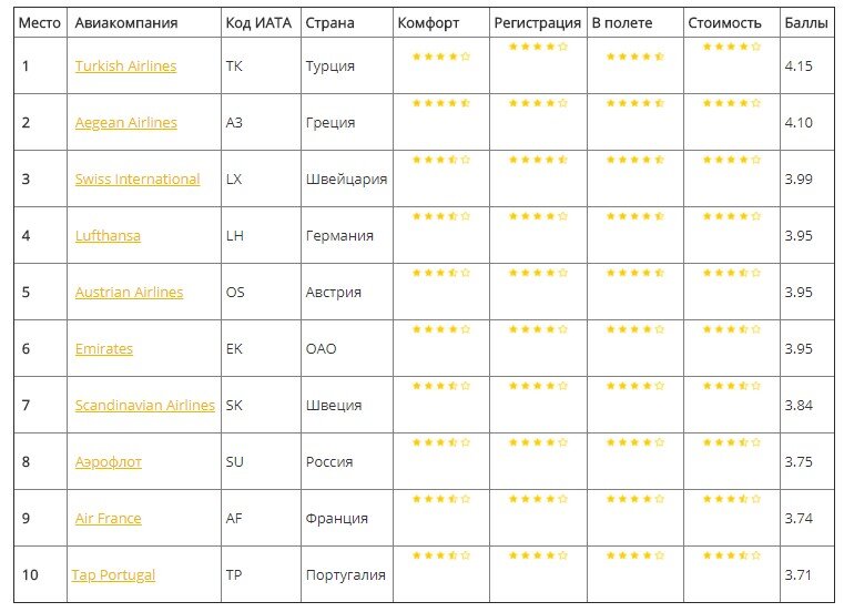 Лидером Топ-10 рейтинга лучших авиакомпаний мира стали Турецкие авиалинии, которые, помимо завоевания первого места в общей категории, также заняли верхнюю позицию для экипажей в полете и VIP-зала. Медленно, но верно Aegean Airlines продолжает подниматься на вершину — в этом году она снова поднялась на одну позицию вверх — с бронзы на серебро благодаря отличной цене, качеству услуг, и своим стюардам и хозяевам, всегда готовыми удовлетворить потребности пассажиров. Третье место заняла Swiss International Airlines, она продвинулась на три места в общей категории и сумела заработать медаль за свои современней самолет и гибкости регистрации. В Топ-10 рейтинга также вошли Lufthansa, Austrian Airlines, Emirates, Скандинавские авиалинии, российский «Аэрофлот», «Air France» и Tap Portugal. Немного поподробнее о первой тройке.
