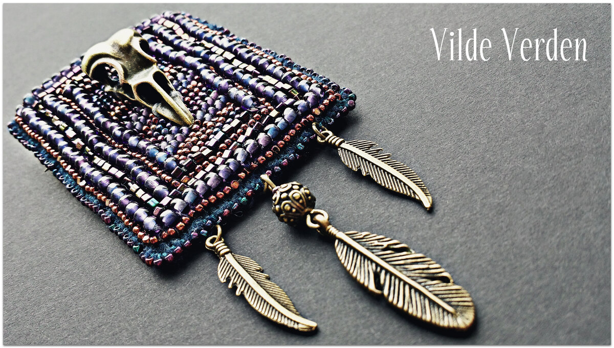 А уж когда я обнаружила, что бисер и металл могут подружиться... в общем, вы поняли, что восторгам моим не было предела))) Работать с бисером мне очень понравилось, так что броши в данной технике последними точно не будут. А там - кто знает, на что хватит фантазии в моей буйной головушке, главное, не утонуть в купленном материале ;Р Итог: представляю вам вот такую мозаичную бисерную брошку космической расцветки, украшенную перышками и миниатюрным черепом. Крепится на удобную булавку, с обратной стороны