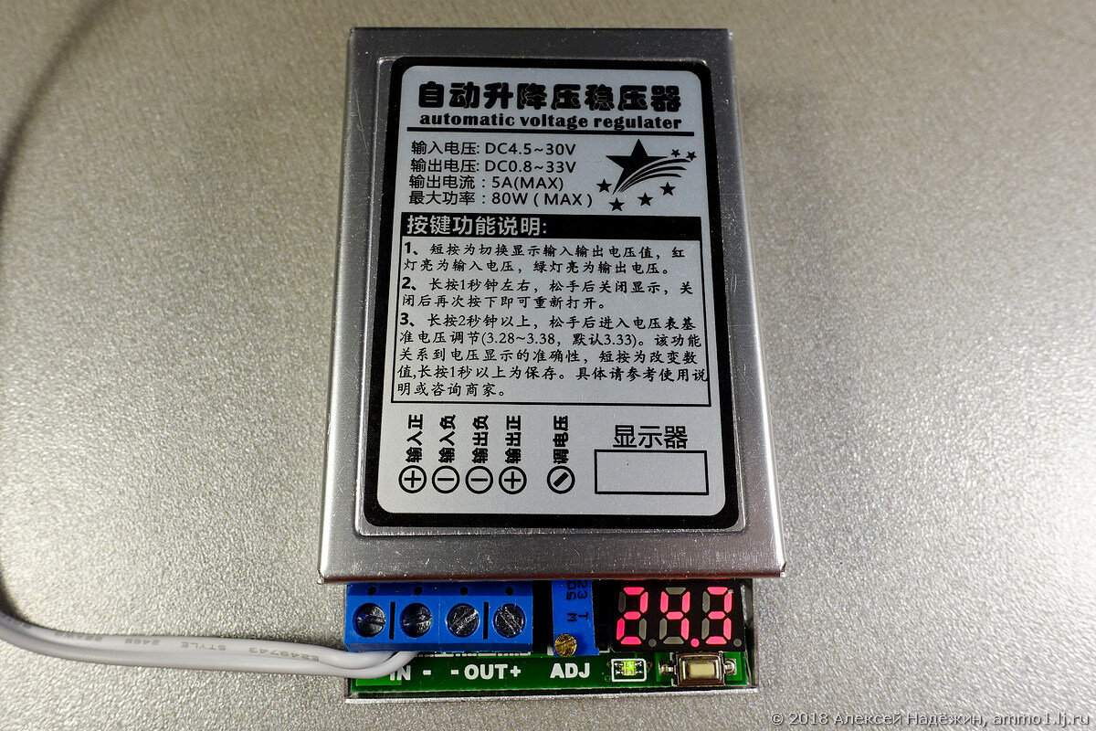 Это устройство способно выдавать на выходе постоянное напряжение от 0.8 до 30 вольт с током до 5 ампер при напряжении на входе от 4.5 до 30 вольт. Цифровой индикатор показывает напряжение на выходе или на входе.