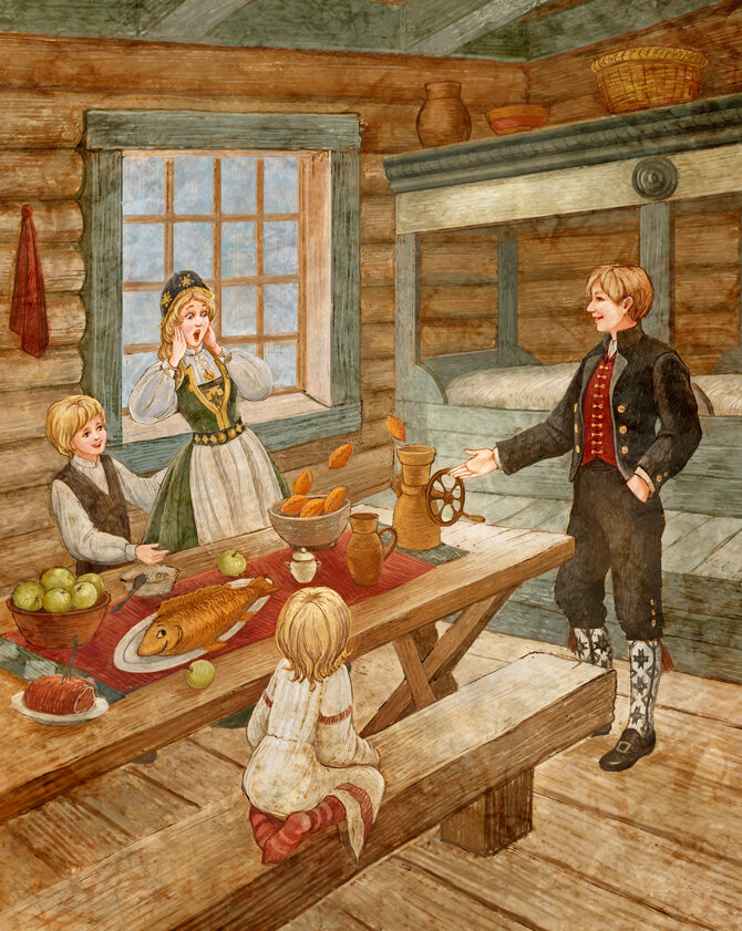Поставил он мельницу на стол и велел, чтобы она намолола и свечей, и каши, и свинины, и пива, и разной другой снеди для рождественского ужина.