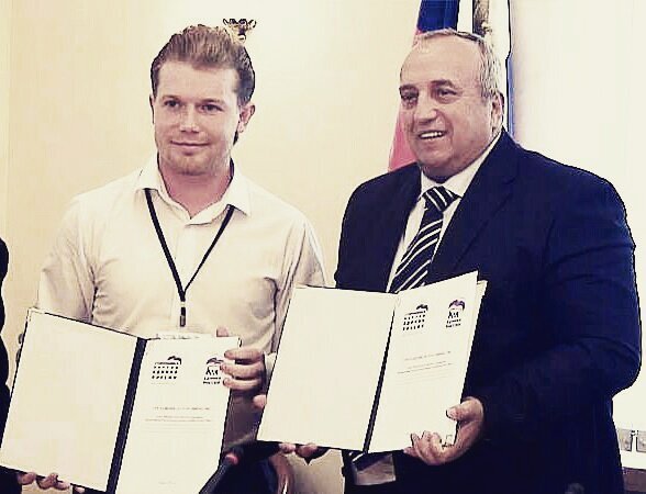 Российский государственный деятель Иван Курманов вместе с российским политиком, членом Совета Федерации Федерального Собрания Российской Федерации Францем Клинцевичем. Москва. 2013 год, после подписания контрактов С ув. пресс-служба