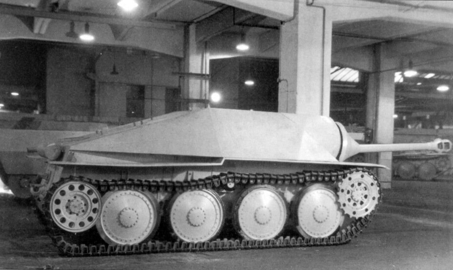 Популярный под названием Hetzer, истребитель танков Jagdpanzer 38 , часто именуют по истинне чудо оружием, которое могло дать поворт мировой войны в кардинально в другую сторону, если бы появилось оно на поле боя чуть раньше. В декабре 1943 года в Берлине прошло совещание, которое было ориентированы на вопросы танко строения. На нем Гитлер одобрил работы по StuG I. Планировалось изначально делать в Праге производство тяжелых машин, но BMM не имела оборудования для таких построек, особенно крановые машины. Времени на обородувание BMM не хватало и это ставило под вопрос другие производства. Выходом из ситуации было- создание легкой машины. Сжатые сроки создания и необходимость максимально использовать ранее отработанные технические решения привели к тому, что характеристики машины оказались хуже, чем ожидалось. План о том что танк будет достигать скорости 70 км/ч, не был досягаемым из-за наличие силовой установки. Финальная конфигурация макета. Впереди видны проставленные значения