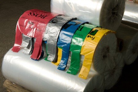 Пленки. В зависимости от назначения полиэтиленовая упаковка может изготавливаться из первичного или вторичного полиэтилена. Вторичный полиэтилен изготавливается из пластмассовых отходов. Повторное использование пластмассы снижает загрязнение окружающей среды. Перед изготовлением пленки исходный материал окрашивается в нужный цвет. Пакеты из различных типов пленок. Мягкие пакеты с петлевой ручкой делаются с использованием полиэтилена высокого давления. У таких пакетов высокая прочность, пластичность и морозоустойчивость. Пленки