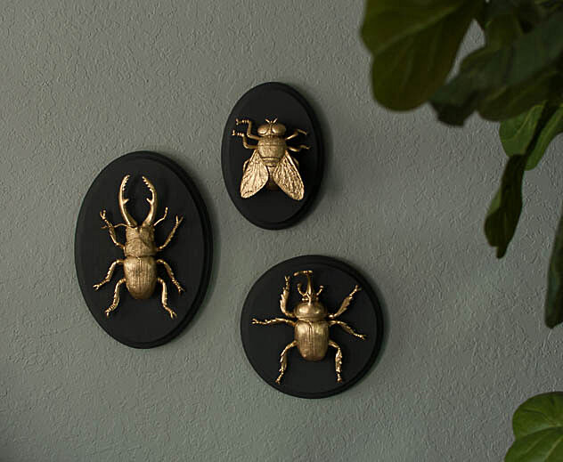 Возможно, кто-то скажет, что это не очень хорошая идея, и будут правы. Не совсем приятно видеть у себя на стене огромных, хоть и не живых, жуков. Но такие золотые жуки не испортят настроение, а скорее всего добавят изюминку в ваш интерьер. Для работы понадобятся: - деревянные заготовки для панно разных форм, - тонкая наждачная бумага, - большие пластиковые насекомые (часто продаются в киосках в детских наборах), - темная краска (здесь черная), - золотая краска, -кисти, - прозрачный лак-спрей, - горячий клей-пистолет, - двусторонний скотч. Слегка ошкурите заготовки, покрасьте их выбранным цветом краски. Дайте высохнуть. Окрасьте золотой краской насекомых и дайте им высохнуть. Примечание: иногда золотая краска плохо держится на пластике, поэтому сбрызните насекомых лаком-спреем и окрашивайте. Можно покрыть несколькими слоями золотой краски, в зависимости от её прозрачности. Прикрепите горячим клеем-пистолетом позолоченных насекомых к деревянным дощечкам. Прикрепите двусторонние п