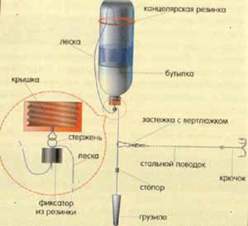 Груз отправляем в воду, затем крепим леску на булавке резинкой так, чтоб бутылочка приняла вертикальное положение к верху дном. Во время клева резина слетит с булавки, наша тара освободившись от груза, выскочит на верх и уляжется на бок, вслед за тем леска с бутылки легко начнет сматываться. Чтобы