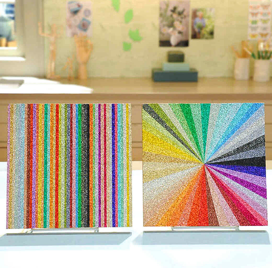 Иногда нам хочется изменить свою комнату, немного приукрасить и добавить интересных деталей. Предлагаем идею необычного декорирования стен с помощью глиттерных панно. Они добавят блеска и необычности в ваш интерьер. Материалы для работы: - квадратные листы фанеры, - наждачная бумага, -клей виниловый для обоев или ПВА, -малярная лента или изолента любой ширины (в зависимости от ширины полосок, которые вы хотите сделать), -пластиковые лотки (любые ёмкости для стряхивания глиттера), -сухой глиттер разных цветов, -кисть, карандаш, линейка. Пройдите наждачной бумагой по острым углам и краям фанерной доски. Разлинуйте карандашом доску на полоски той ширины, как вы задумали. Возьмите изоленту или малярный скотч и заклейте ими вторую полоску с края на квадрате. Намажьте клеем полоску рядом, не закрытую скотчем. Не ждите, когда клей высохнет, посыпьте клеевую полоску сухим глиттером. Полоска должна быть полностью им покрыта. Остатки глиттера стряхните в пластиковый лоток. Продолжайте поочер
