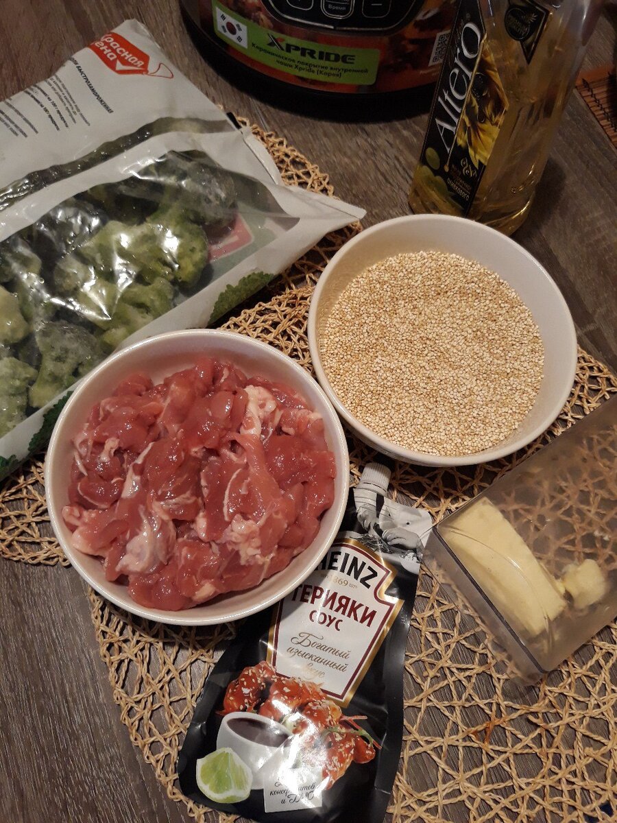 Соль Выложить брокколи без предварительной разморозки в вок с добавлением растительного масла. Обжарить - потушить минут 5-7 до выкипания воды. К брокколи добавить мясной гуляш. Продолжать обжаривать минут 15. Добавить соус терияки. Он обладает ярким кисло-сладким вкусом, дополнительное подсаливание не требуется. Тушить мясо с овощами до полной готовности около 10 минут. Параллельно приготовить гарнир: Киноа хорошо промыть, выложить в чашу мультиварки вместе с водой в соотношении 2:1 (аналогично рису). Готовить в режиме "крупы до полного разваривания. В ходе варки посолить по вкусу, в конце до