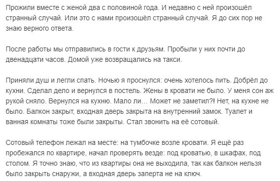 История про мужа, которому захотелось ночью попить водички, но когда он вернулся с кухни, то увидел, что спящая жена куда то пропала. Входная дверь закрыта из нутри, балкон тоже, ни каких следов жены, муж начинает сходить сума! Пришли свою историю на почту: zamuznie@yandex.ru