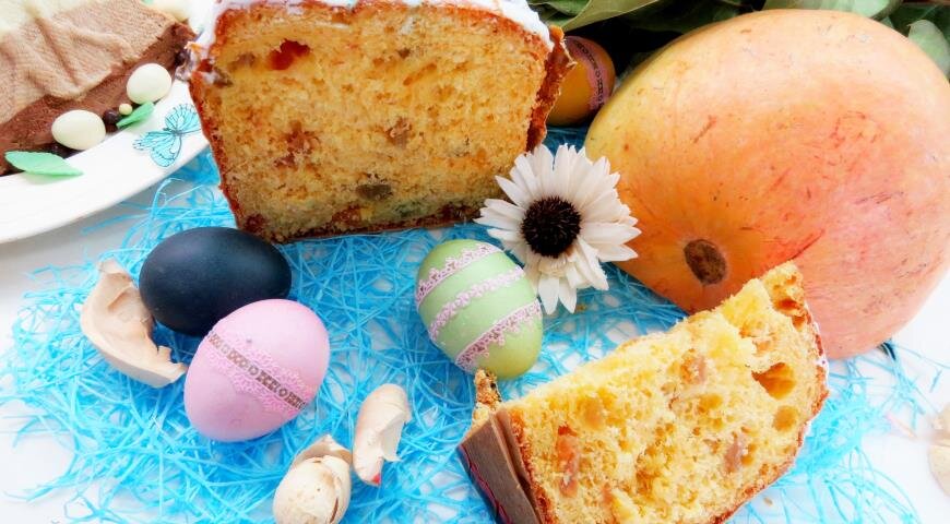 Замечательный кулич! Получается очень ароматным, ярким и сочным. Учитывая не трудоемкость рецепта, результат получается потрясающий. ИНГРЕДИЕНТЫ ПОШАГОВЫЙ РЕЦЕПТ ПРИГОТОВЛЕНИЯ Шаг 1 Цукаты заранее помыть и замочить в яблочном соке с добавлением коньяка (по желанию). Шаг 2 Тыкву помыть, почистить и отварить до мягкости (я варила на пару в пароварке). Шаг 3 Пробить отваренную тыкву блендером до однородности или протереть через сито. Отвесить 150 г. Шаг 4 В чашу миксера добавить яйца, молоко, сахар и ванильный сахар (лучше с натуральной ванилью), растопленное сливочное масло, соль и пюре тыквы, все перемешать. Шаг 5 Добавить просеянную муку и быстродействующие дрожжи (на упаковке таких дрожжей написано, что они добавляются сразу в муку). Шаг 6 Замесить тесто, добавить цукаты, еще раз хорошо вымесить тесто и поставить в теплое место. Тесто должно подняться в 2 раза. Шаг 7 После того как тесто поднялось и увеличилось в 2 раза (на это уйдет час-полто