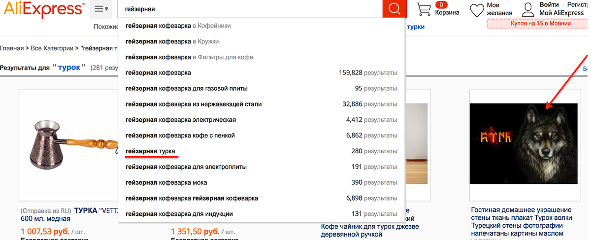 Еще там встречаются смешные штуки типа “гейзерная турка”. На деле это ошибка в подсказке. Если начать писать “гейзерная” он подставит “турка” и покажет турки, футболки с турецким флагом и почему-то плакаты с волками.