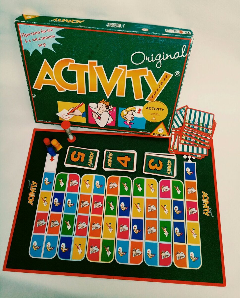 Следующая игра о которой мы расскажем очень популярная во всем мире, весёлая, динамичная и имя ей "Activity" (Активити). Существует она уже больше 25 лет, а изобретена австрийскими друзьями, любителями настольных игр. У нас эта игра уже много лет и для вечера в большой компании самый подходящий вариант ведь рассчитана игра на 4-16 играков. "Активити" объединяет несколько игр в одну, и поэтому для прохождения игры придется показывать, объяснять или рисовать слова участникам своей команды. Игра состоит из игрового поля с цветными ячейками действий (объясняем, показываем, рисуем), 4 фишки команд, песочных часов на 1 минуту и карточек со словами разной сложности (3;4;5). Сейчас можно приобрести "Активити" в разных версиях: для детей (от 8 лет) и малышей (от 4 лет), с направленной тематикой спорт или с дополнением действий. Наша игра "Активити" классическая издательства 2010 года, новые версии игры оформлены чуть по другому ,но суть остаётся прежней. Правила в игре очень простые, игроки де