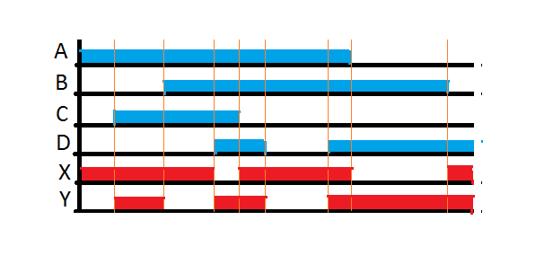 Напомню задачу, необходимо нарисовать схему для следующей диаграммы. Итак по порядку. Как ни странно, но тут всё просто. 1 Составим таблицу из четырех столбцов входных и двух выходных. 2 Заполняем эту таблицу, Точнее в левой части заполняем все встречающиеся состояния, а именно если на диаграмме высокий уровень (синяя полоса), то это 1, если пустое место, то это 0. Если приглядеться, то видно что специально выделен переход от одного состояния до другого. Получаем таблицу: 3 Смотрим внимательно и видим, что строчки 5 и 7 повторяются, значит можно упростить, точнее 7 строчку просто исключить. 4 Далее внимательно читаем и действуем также, Используем те строчки, где Х=1 и записываем Получили 6 строчек. Как можно трактовать первую строчку (читаем медленно):Х = 1 в том случае, если одновременно равны единице, А, НЕ В, НЕ С и НЕ D, так как они одновременно, то умножаем, так как в логической алгебре допустимо опускать знаки умножения, то мы переписали в удобном виде. А вот следующее за