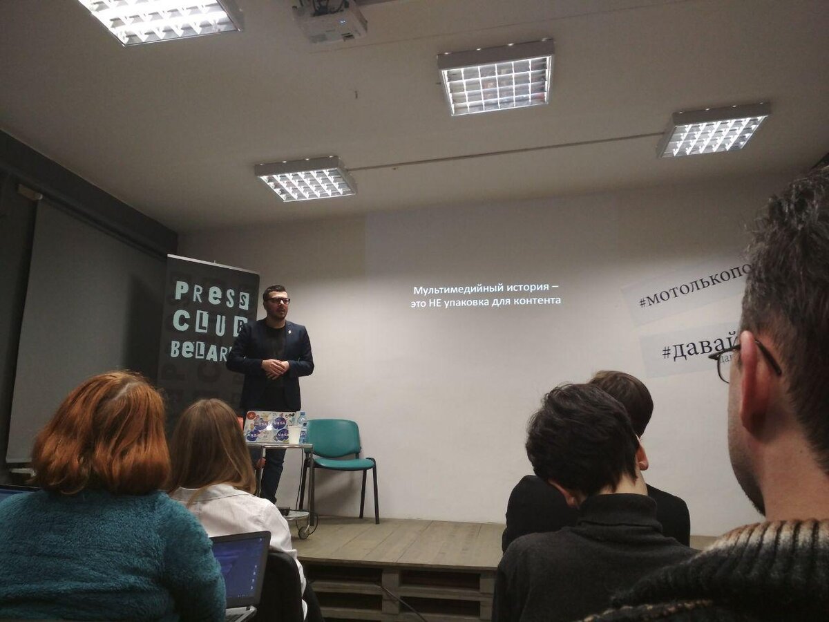 Мультимедийная история: зачем она нужна и по каким принципам выстраивается - рассказывал 15 марта в Пресс-клубе Артём Галустян (Россия) — журналист, продюсер мультимедийных проектов. Работал выпускающим редактором спецпроектов в ИД «Коммерсантъ», он же автор мультимедийных историй «Земля отчуждения», «День, когда кончилась война» и «7 дат». Что такое сторителлинг? Media storytelling (мультимедийные истории) – новое понятие, которое нельзя путать со старыми (лонгрид). Это история, в которую аудитория погружается через несколько органов чувств. Это формат, а не жанр. Первый ярко выраженный институт мультимедийных историй – церковь. В церкви рассказывают библейские истории, подключая ваши органы чувств (витражи на стеклах, свет, музыка, запахи). В New York Times этот формат называют meaningful stories. Заблуждения Мультимедийная история – это вовсе не красиво упакованный текст. Текст - это просто код, которым мы выражаем мысли. Если выбираем форматом повествования текст, то