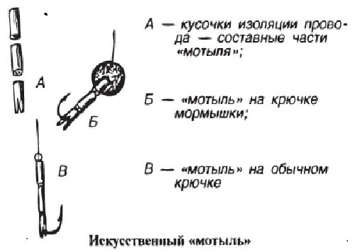 В наше время рыбаки очень часто используют всевозможные искусственные приманки. Искусственный мотыль знаменитая приманка среди искусственных. На него идет язи, лещи, голавли, густера, ерш, плотвичка. Данный вид приманки можно приобрести в специализированном магазине, а также возможно изготовить самому. Нам понадобится изоляция провода диаметром 1,5мм. Цвет желательно брать алый. Насаживаем на крючок (обычный) или маленькую блесну. Нарезаем 3 куска изоляции. Два длиной 1- 1,2мм, третий 4мм. На третьем колечке делаем вырез по форме похожий на треугольник в глубину 1,5мм. Большое кольцо надевается на половину длины. Когда сдвигаем все колечки к телу мормышки выходит схожая на настоящего мотыля приманка. При помощи этой приманки улов будет побольше чем с настоящим мотылем. Один минус приманку желательно приводить в движение все время, так как на неподвижного мотыля. Также чередуем резкие движения с плавными. Также возможно изготовить мотыля желтого цвета. С такой наживкой хорошо идет