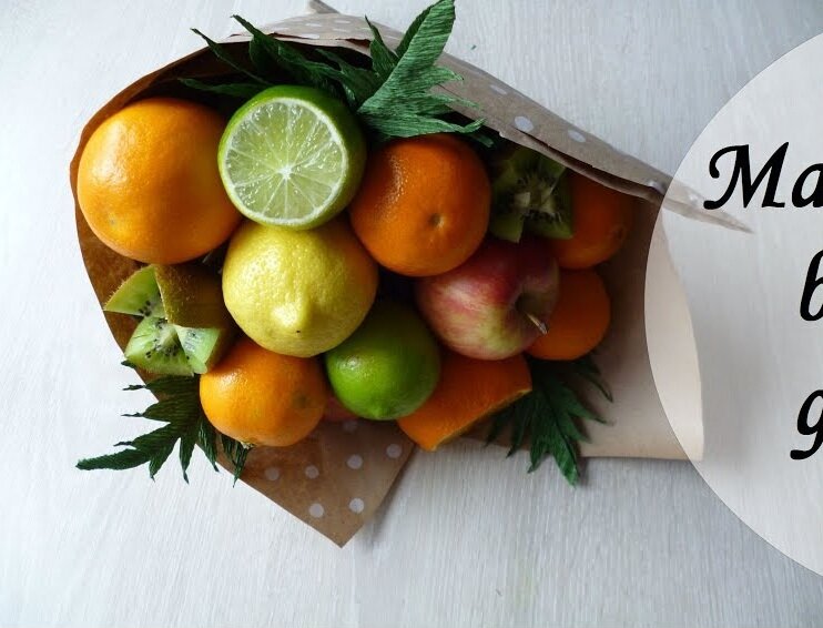 Сегодня я покажу мастер-класс по созданию фруктового букета, а также покажу вам, как сделать декоративную веточку листвы и красиво упаковать букет в крафт бумагу.