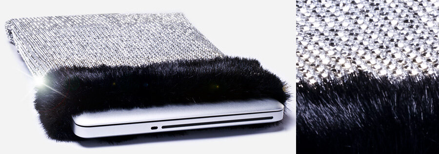 Самый дорогой в мире чехол для ноутбука Diamond Laptop Sleeve от голландской компании CoverBee вручную украшен 8800 редких бриллиантов из разных уголков планеты. Обложка отделана натуральным черным соболиным мехом из Сибири – дизайнеры уверяют, что использовали лишь мех животных, умерших естественной смертью. Бриллианты прикреплены к коже, а мех, находящийся с внутренней стороны чехла, надежно защитит ноутбук и согреет его при минусовой температуре. На создание бриллиантового чехла ушло два года.