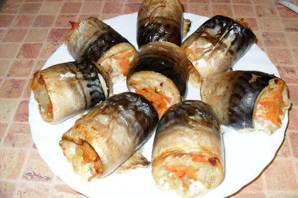 Очень вкусно и оригинально Вам понадобится: Скумбрия - 2 шт. Сыр - 100 гр. Лук репчатый - 1 шт. Морковь - 1 шт. Чеснок - 1 зубчик Болгарский перец - 1 шт. Зелень - по вкусу Соль, перец - по вкусу растительное масло - 2-3 ст.л. Приготовление: Скумбрию разморозить при комнатной температуре. Очистить овощи, порезать лук и болгарский перец кубиками, морковь натереть на крупной тёрке, чеснок разрезать на четыре части. На растительном масле обжарить чеснок. Как только он отдаст свой аромат, убрать его со сковороды, на чесночном масле пожарить лук и морковь до полуготовности, затем добавьте перец, ещё потушить и в самом конце добавить зелень, соль, перец. У каждой тушки скумбрии отрезать голову, удалить внутренности. Хорошо промойте внутри и разделите по хрепту рыбку на две филешки. Мелкие косточки уберите пинцетом Каждую половинку посолить, поперчить, сбрызнуть лимоном. Внутреннюю сторону филе щедро посыпать сыром, на сыр уложить овощи, затем каждый кусочек свернуть в рулет, скрепить зубочис