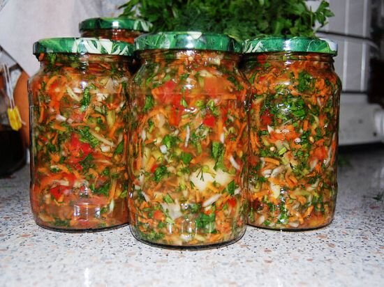 Вам понадобится: Помидоры - 500 гр. Лук репчатый - 500 гр. Морковь - 500 гр. Перец болгарский - 500 гр. Петрушка - 300 гр. Соль "Экстра" - 400 гр. Приготовление: Морковь натереть на крупной тёрке. Лук и перец нарезать на тонкие полоски. С помидоров снять кожицу и тоже порезать. Зелень мелко порубить. Добавить соль, всё перемешать и через 10 минут разложить по банкам по 0,5 л. вместе с соком и закатать крышками. Заправка хорошо храниться при комнатной температуре. Из такого расчёта продуктов получается 4 банки. Приятного аппетита! Если вам понравился рецепт, Ставьте лайки! Подписывайтесь на мой канал! Вам не сложно а мне приятно! Все мои рецепты и мой канал.