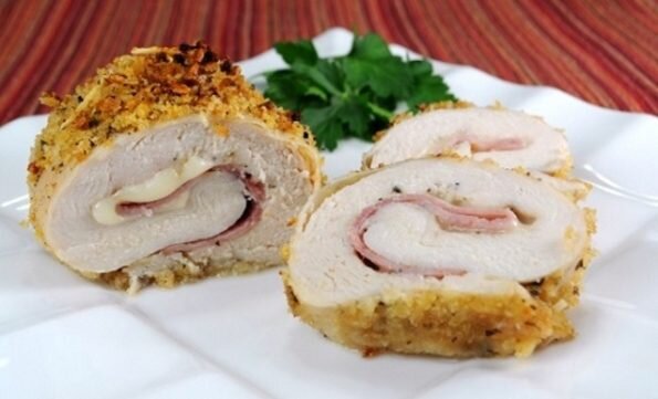 Куриное филе отбить и посолить. В центр положить тонкий кусочек ветчины и сыра. Завернуть рулетиком. Обмакнуть в яйцо и панировочные сухари. Жарить на растительном масле до готовности. Можно запечь рулетики в духовке.