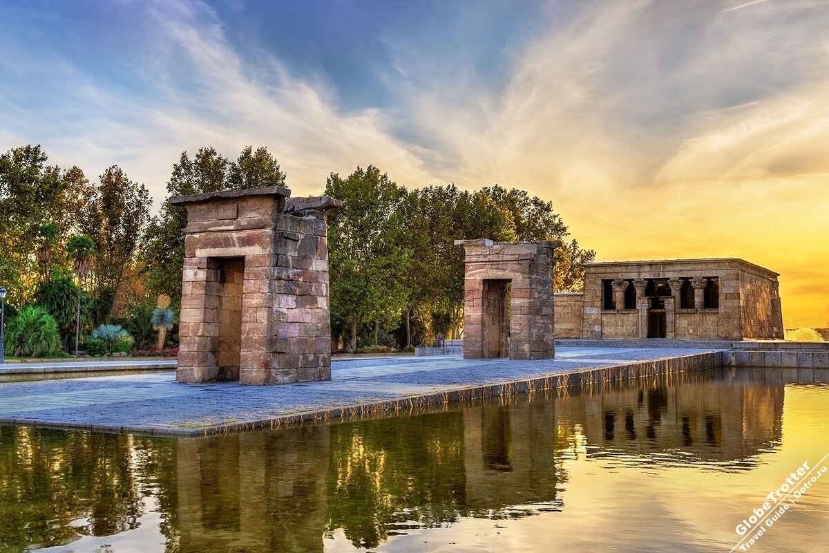 Путешествуя по Испании, нельзя не посетить необычайной красоты место. Речь идет о храме Дебод, находящимся в Мадриде. Данная достопримечательность была возведена около 2000 лет назад, но не в Испании, а в Египте. Еще за II в. до н.э. мероитский царь Адиджаламани начал постройку этого храма и посвятил его богам Амону и Изиде. Их молельня украшена самыми древними рельефами. И усилиями последующих правителей здание обзавелось новыми постройками. Когда в ХХ веке на Ниле началось строительство Асуанских плотин, храм был частично затоплен, вследствие чего многие его украшения и изображения богов погибли, и во избежание окончательного разрушения Дебода, его по камню перевезли в Мадрид и там восстановили. И вот в 1972 году состоялось открытие храма в Испании. Теперь любой желающий, посетив это удивительное место, может увидеть макеты и фотографии, которые будут рассказывать об истории этого сооружения и культе бога Амона. А озеро, в котором отражается храм Дебод, пожалуй, лучшее место, где м