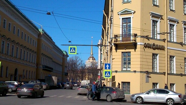Хотя если не знать, то можно подумать что это панорама, открывающаяся с Невского проспекта. А если еще подумать, то можно вспомнить, что такой же вид на Адмиралтейство вам открывался несколько минут назад, с Гороховой улицы, когда вы шли по Малой Морской от Невского к Исаакиевскому собору.