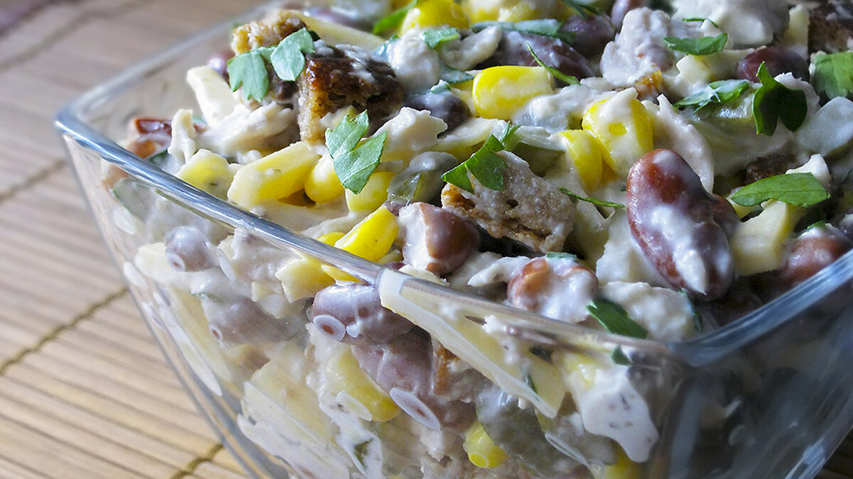Салат очень простой,но в тоже время очень вкусный и полезный. Полезный из за наличия в его продуктах диетической курятины. Готовить салат не сложно. И даже если у вас еще нет кулинарного опыта,то вы с легкостью его приготовите. Продукты для приготовления салата приобретаются в любом продуктовом магазине по доступной цене. Ингредиенты: Способ приготовления: Сначала возьмите куриное филе которое будет необходимо нарезать небольшими кусочками. Далее ломтики черного хлеба натрем чесноком, солью, после чего нарежем их на небольшие кубики и подсушим их на сковороде без масла. Возьмем огурчики и так же нарежем их на небольшие кубики. Сыр режем соломкой или кубиками на ваше усмотрение. Петрушку вымоем, обсушим и мелко по шинкуем. Собираем все ингредиенты в салатнике: куда кладем кусочки курицы, фасоль, сыр соломкой, кукурузу освобожденную от жидкости, кубики маринованных огурчиков, петрушку, наши сухарики черного хлеба и добавляем сюда майонез. Теперь все перемешаем и наш вк