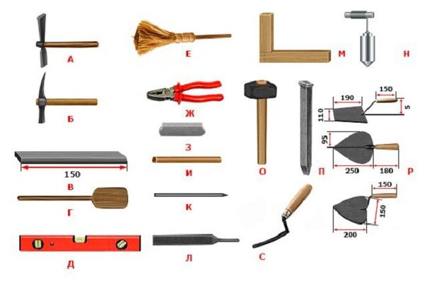 Инструменты для выполнения работ Для процесса возведения печи понадобятся следующие приспособления и инструменты: