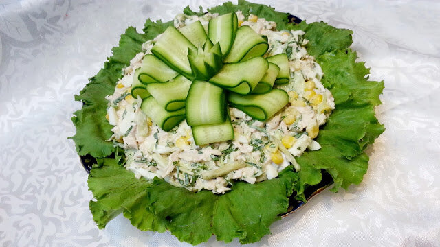 400 г курицы 2 вареных яйца 2 соленых огурца 2 простых огурца кукуруза зелень майонез Кипятите курицу в воде. Все продукты смешивают с майонезом. Попробуйте. Легко и удобно.