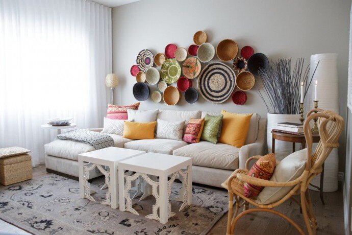 Подбирать тематику стоит в соответствии с общим стилем помещения, например, для классического подойдут традиционные блюдца с гжельской росписью, цветочными мотивами и т. д., в этническом наиболее уместны необычные тарелки с народной росписью, медные подносы, в лофт – изделия с абстрактными рисунками. Ценителям кантри-стиля стоит выбрать плетеную посуду, также в их интерьере будут уместны белые керамические блюда разной формы, как однотонные, так и с традиционными цветочными мотивами. Нюансы применения для декора Хотя существует масса вариантов расположения тарелок на стенах и создания их композиций, нужно учитывать и нюансы. Если ваше жилище строго выдержано в стиле минимализма, используйте сразу не более трех разных холодных тонов для элементов декора и следите, чтобы узоры на них были одной тематики.