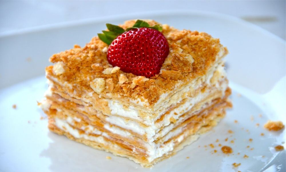 Торт Наполеон Здравствуйте всем. Сегодня поделюсь с вами рецептом вкусного торта Наполеон. Я думаю у многих этот десерт ассоциируется с детством, а ещё — с Новым годом. Потому-как, чаще всего, именно на этот праздник наши мамы и бабушки баловали нас этим шедевром. К сожалению, в наше время покупной магазинный аналог мало, чем похож на классический торт Наполеон, поэтому единственным вариантом попробовать настоящий, самый вкусный слоеный торт с нежным заварным кремом, будет вариант самостоятельного приготовления в домашних условиях. Хлопотно, но оно того стоит! Ингредиенты: Для теста: Для заварного крема: Подготовьте ингредиенты для теста. Обратите внимание на то, что тесто для торта нужно вымешивать с помощью ножа. Так холодное масло не будет таять от тепла ваших рук и возьмет то количество муки, которое нужно. Иначе, переборщив с мукой, вы рискуете получить очень жесткое тесто. Тогда как в идеале тонкие коржи должны быть хрусткими и в тоже время нежными. Слег
