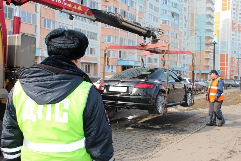 Идет эвакуация неправильно припаркованного автомобиля у дома №20 по улице Борисовке в г.о.Мытищи.