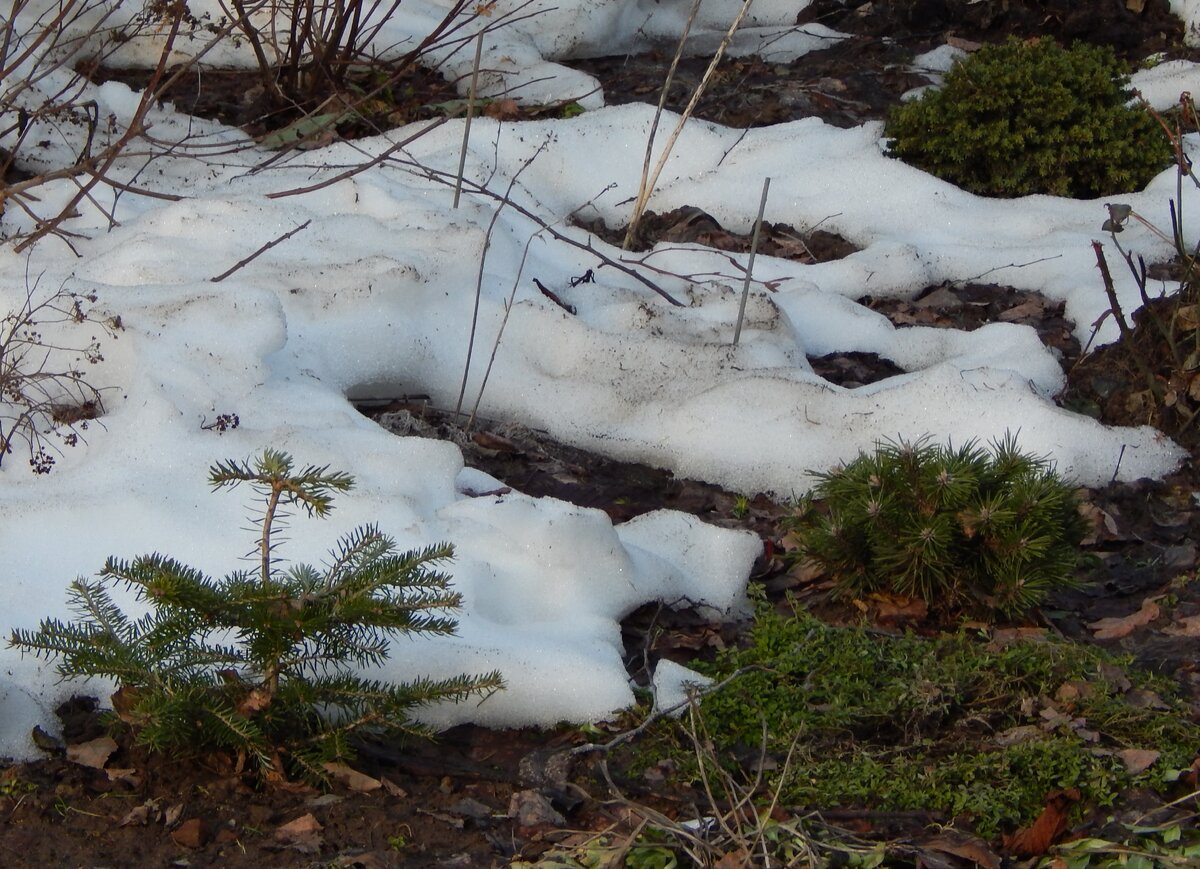 Снег тает стремительно. Ещё позавчера он сугробом располагался в этом месте , а сегодня из-под него показались ёлки. Ёлки - это общее название. Правильно было бы сказать "хвойные", потому что за последние 2-3 года я собрала целый детский сад из маленьких сосен, пихт, можжевельников, тсуг, туй и собственно ёлок. Но "ёлки" как-то милее, как-будто из детства, когда мы в ожидании новогодних праздников по-особенному относились к вечнозелёным красавицам. Мои ёлки ещё совсем крошки. Пройдёт лет пять, прежде чем они станут по-настоящему заметными и их перестанет заметать с макушкой снег зимой. Хотя нет, ведь некоторые из них шаровидные, и если снега выпадет много, их не будет видно. Как раз на верхнем фото слева видна пихта корейская Бриллиант, справа сосна горная Мопс, а вверху ель обыкновенная Литтл Джем. Все они карлики, будут расти долго и сильно не вырастут, но при этом останутся не менее привлекательными, чем их хвойные родственники-великаны из тайги. Меня же они устраивают как раз с