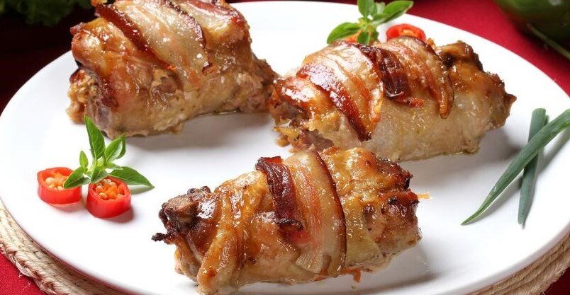 Фаршированные куриные рулеты с соусом. Романтический ужин и не знаете, что приготовить? Этот оригинальный и несложный рецепт как нельзя лучше подходит для романтического ужина. На гарнир к блюду можно подать отварной картофель. ИНГРЕДИЕНТЫ: · куриные грудки (с кожей) · 6 ломтиков бекона · 200 мл овощного или куриного бульона · 250 г шпината · 100 мл (или 4 ст. л.) сметаны · 60 г твердого сыра · соль, молотый черный перец · масло оливковое – 2 ст.л. ПРИГОТОВЛЕНИЕ: 1. Куриные грудки положить на разделочную доску. С помощью скалки или тяжелой сковороды придавить каждую грудку, чтобы она стала почти вдвое тоньше, чем была. 2. С бекона срезать кожу и положить 3 ломтика на разделочную доску, слегка растягивая их и заезжая одним на другой, чтобы получился прямоугольник. Сверху положить куриную грудку. Повторить с оставшимся беконом и курицей. 3. Шпинат промыть, удалить жесткие стебли. На каждую грудку поместить по 4 листика шпината и слегка прижать, чтобы они распрямились. Сыр нарезать м