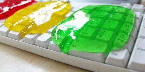 - тара для смешивания Этап 1 В аптеке или в специализированном интернет-магазине покупаем тетраборат натрия или по-простому буру. Растворяем ее в стакане с теплой водой, интенсивно размешивая ненужной ложкой. Этап 2 В отдельную емкость с жидкостью добавляем клей ПВА не переставая перемешивать, затем доливаем еще полстакана теплой воды. Для изменения цвета можно добавить пищевой краситель любимого оттенка. Удивительно, но после изготовления такого «лизуна-помощника» быстро решается проблема как очистить клавиатуру компью