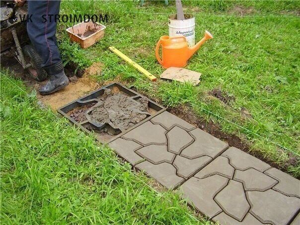 Сами сделаем плитку на дорожку. Изготовить самому пескоцементную плитку достаточно просто, а стоить она будет намного дешевле той, что продается на ближайшем строительном рынке. Оптимальный размер плитки – 30 х 30 см. Это позволит укладывать ее на второстепенных дорожках в один, а на главной - в два ряда. Вначале сделайте опалубку с бортиком высотой 3 см (такой толщины будет и плитка). Для создания рифленой поверхности уложите вниз опалубки резиновый коврик рисунком вверх. Изготовление такой рифленой плитки не только украсит ваши садовые дорожки, но и сделает их более безопасными. Затем приготовьте раствор: на 1 часть цемента марки 400 берите 3 части песка. Залейте опалубку раствором на 2/3 высоты бортиков. Сверху уложите армирующую сетку, которая придаст тротуарной плитке толщиной всего 3 см необходимую прочность. Причем арматуру можно не покупать, а изготовить на месте. Для этого вполне сгодятся старые консервные банки, боковины которых надо разрезать на полоски. Подойдет и про
