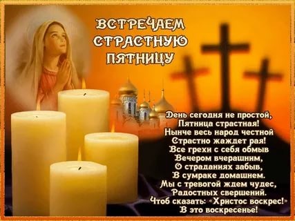Великая Пятница (Воспоминание Святых спасительных Страстей Иисуса Христа) у православных христиан Распятие Пилат говорит им: что же я сделаю Иисусу, называемому Христом? Говорят ему все: да будет распят. Евангелие от Матфея, 27:22 Служба в Великую Пятницу (Великий Пяток) посвящена воспоминанию крестной смерти Спасителя, снятию с Креста Его тела и погребению Его. На утрени (которая традиционно служится вечером в Великий Четверг) посреди храма читаются «12 Евангелий Святых Страстей Христовых», избранных из всех четырех Евангелистов, повествующих о страданиях Спасителя, начиная с последней беседы Его с учениками на Тайной Вечери и кончая погребением Его в саду Иосифа Аримафейского и приставлением воинской стражи к Его гробу. Во время чтения Евангелия верующие стоят с зажженными свечами, показывая этим с одной стороны то, что слава и величие не оставили Господа и во время Его страданий, а с другой стороны — горячую любовь к своему Спасителю. Литургии в Великую Пятницу не бывает, так