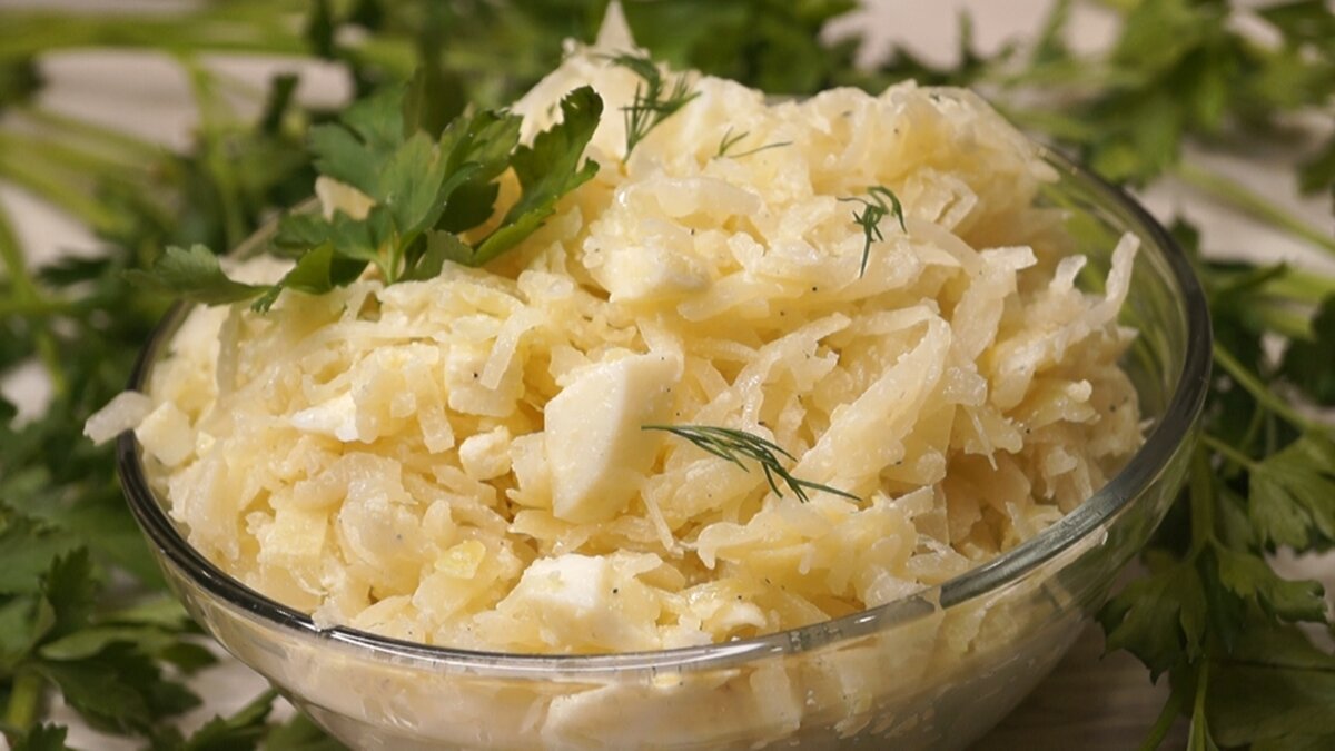 - Капусту нашинкуем и отварим в воде 5 минут. Сливаем и добавляем сливочное масло, обжаренный лук и отварные яйца.